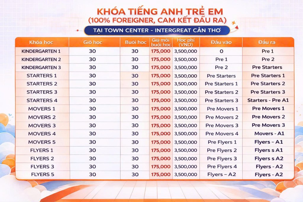 👉 Tại Intergreat Cần Thơ, chúng tôi xây dựng lộ trình tiếng Anh chuẩn Cambridge dành riêng cho trẻ từ 5 tuổi trở lên, học 100% với giáo viên nước ngoài và cam kết đầu ra rõ ràng theo từng cấp độ.